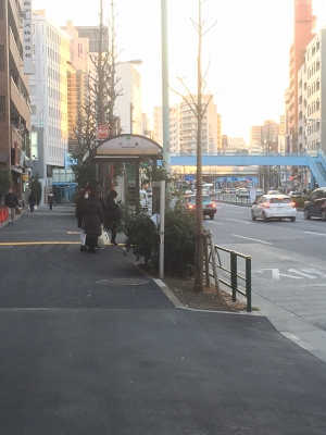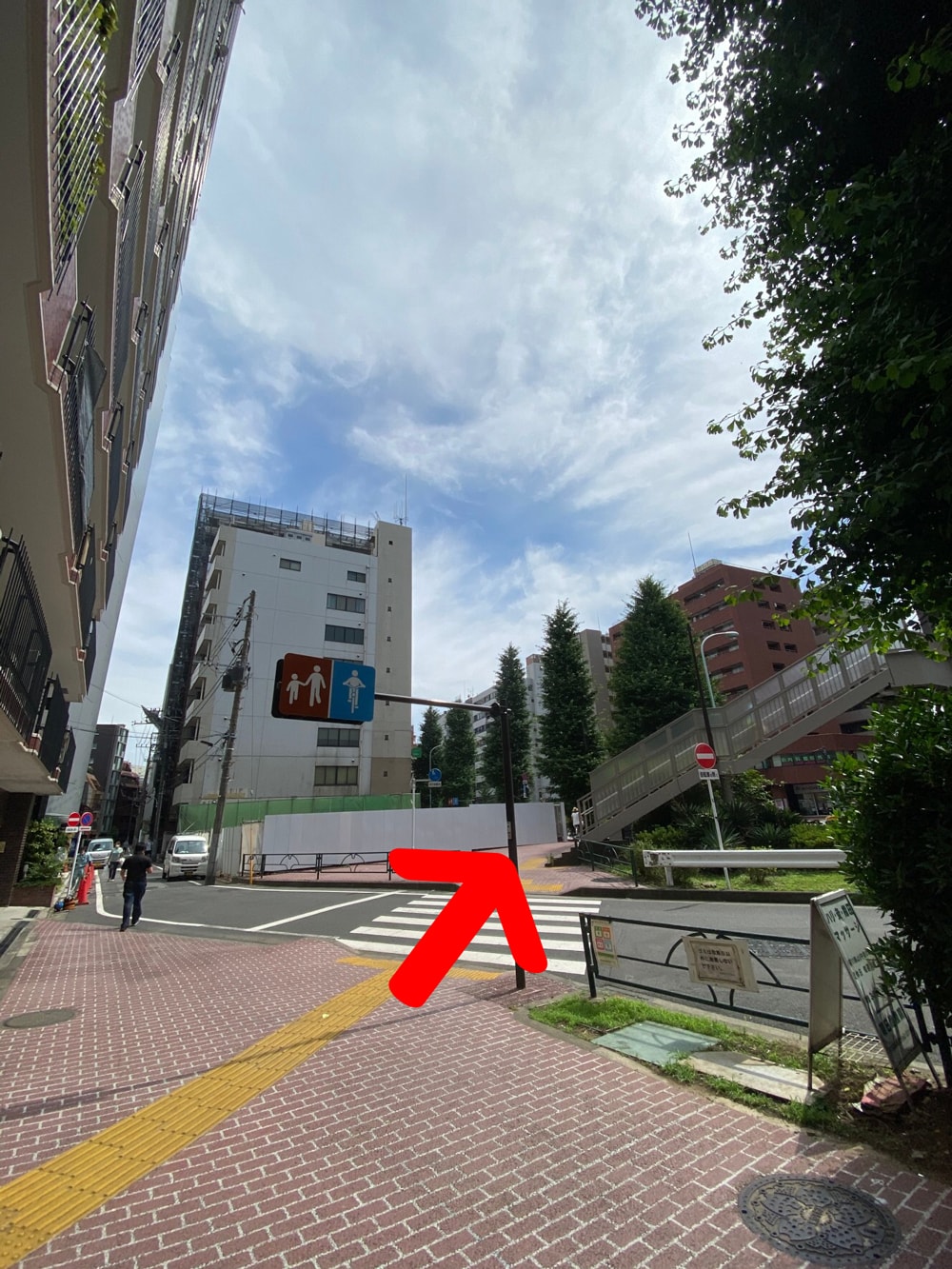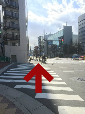 右の横断歩道を渡り、大通り沿いの歩道を直進