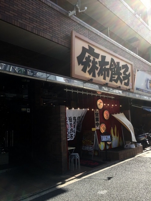 左手に大きな「麻布餃子」と「麻布ラーメン」の看板が見えます。