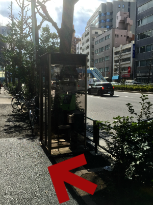 右手に電話ボックス、その左手に下記の「麻布餃子」の看板があります。